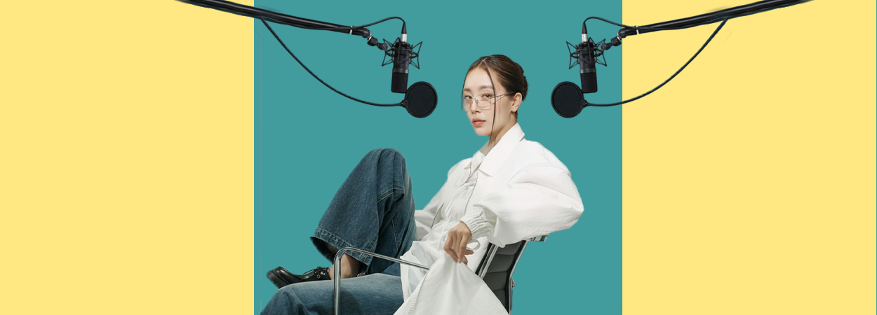 Black headphones on a white background with colorful geometric shapes